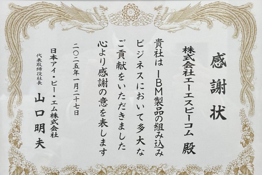 日本アイ・ビー・エム株式会社様から弊社へ「感謝状」が届きました。