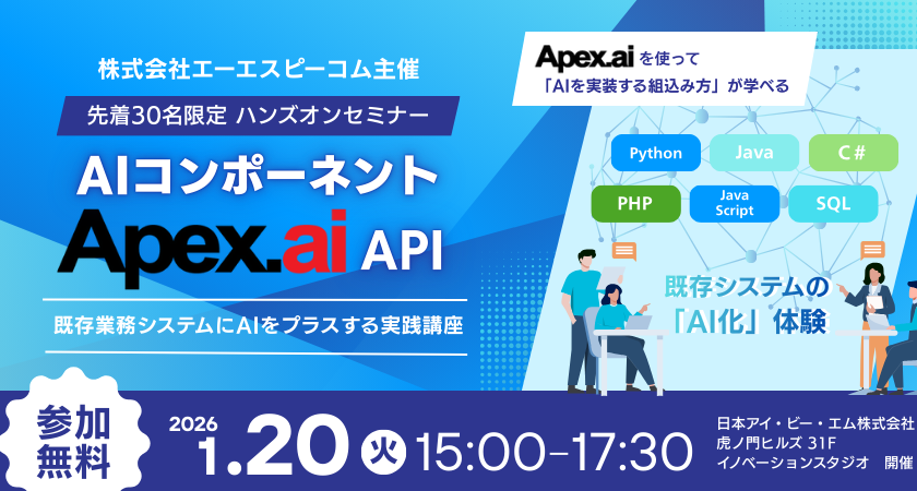 2026年1月20日(火)にエーエスピーコム主催のAIコンポーネント「Apex.ai」APIハンズオンセミナーを開催いたします。