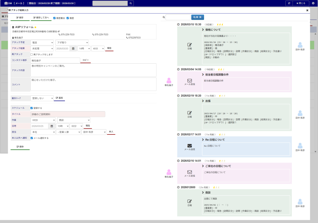 また、アタック結果は簡単に入力でき、顧客履歴と連動して活動記録を残します。