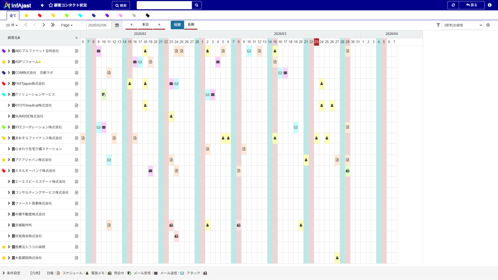 顧客とのスケジュールと顧客履歴を視覚化した機能で、顧客とのコンタクト状況を一括で見れる機能です。ビジネスチャンスを放置してしまうことなくフォローアップする事ができます。