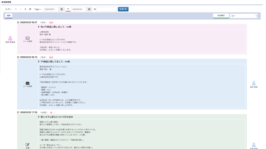 顧客と関連する日報、Eメール、アタック、電話メモなど、顧客に関連する情報を時系列に紐付けて閲覧できます。全情報が集約されているので、顧客訪問する前にチェックしておけば前回の続きで対応ができ、引継の場合も簡単に行なう事ができます。
